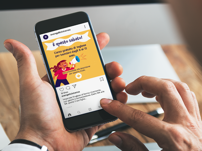 Realizzazione di volantini stampati e contenuto per social media per pubblicizzare il corso gratuito di Inglese offerto da Vicenza Bible Church e Chiesa Evangelica Battista di Vicenza, rivolto ai bambini dagli otto ai dodici anni. L’obiettivo del corso è far avvicinare i bambini alla Parola di Dio in modo dinamico e divertente.